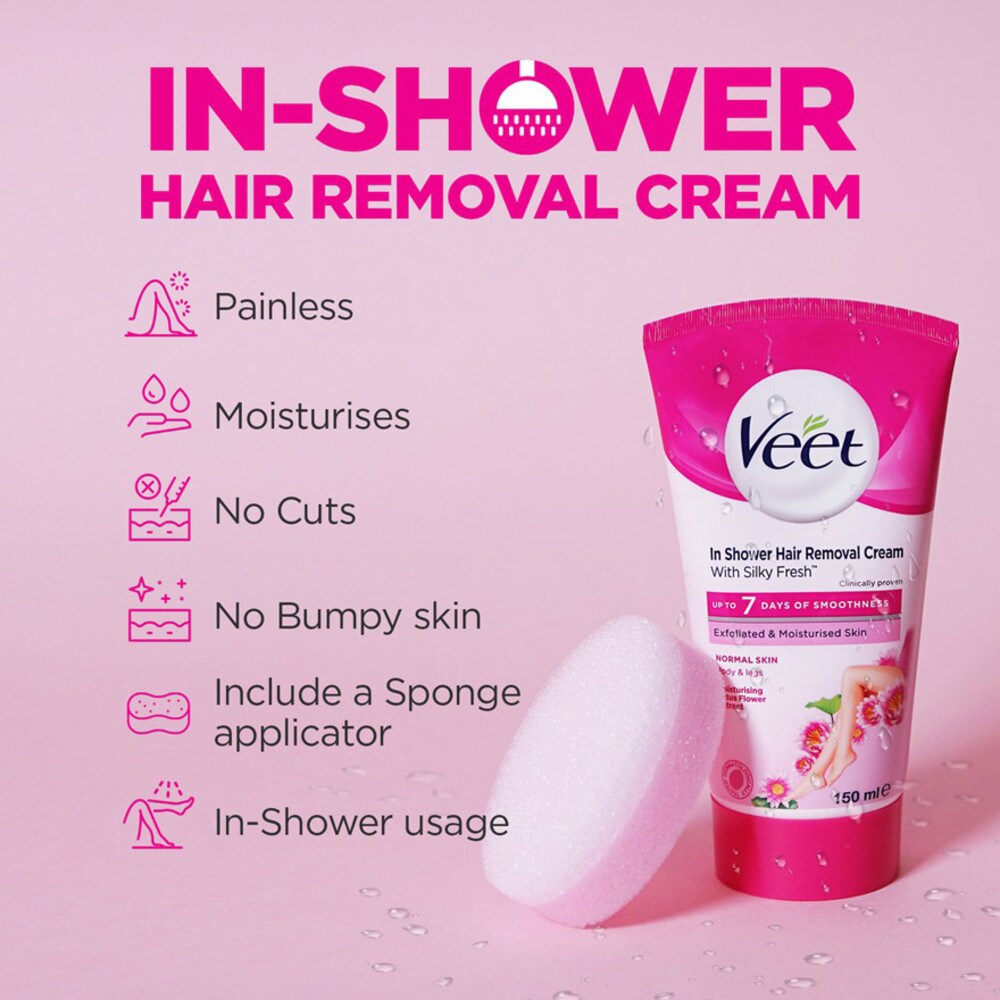 Veet In Shower Hair Removal Cream Directions. Before using please read pack precautions carefully. Before you shower use the soft coloured side of the sponge to apply the cream evenly onto dry skin. Veets cream dissolves rather than cuts hair so unwanted hair takes longer to grow back than with shaving and theres no stubbly feel to regrowth.